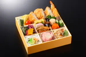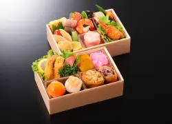海老料理や揚げ物、煮物など彩り豊かな和惣菜を詰め合わせた二段仕立てのお弁当です。
