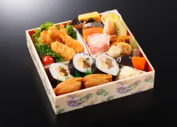巻き寿司やいなり寿司を中心に、海老フライや焼き魚、煮物など彩り豊かなお料理を詰め合わせた華やかな幕の内弁当です。