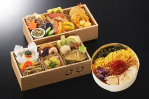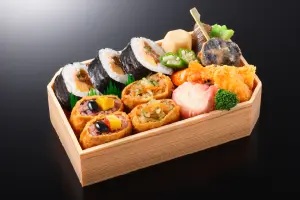 巻き寿司やいなり寿司を中心に、海老フライや焼き魚、煮物など彩り豊かなお料理を詰め合わせた華やかな幕の内弁当です。